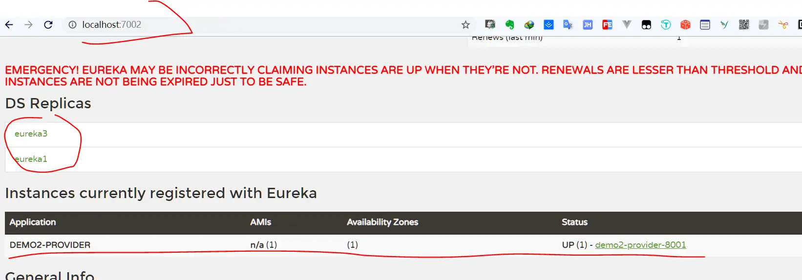- 然后依次修改其他的两个eureka项目,最后再用浏览器打开任意一个eureka项目的地址,可以看到如下界面