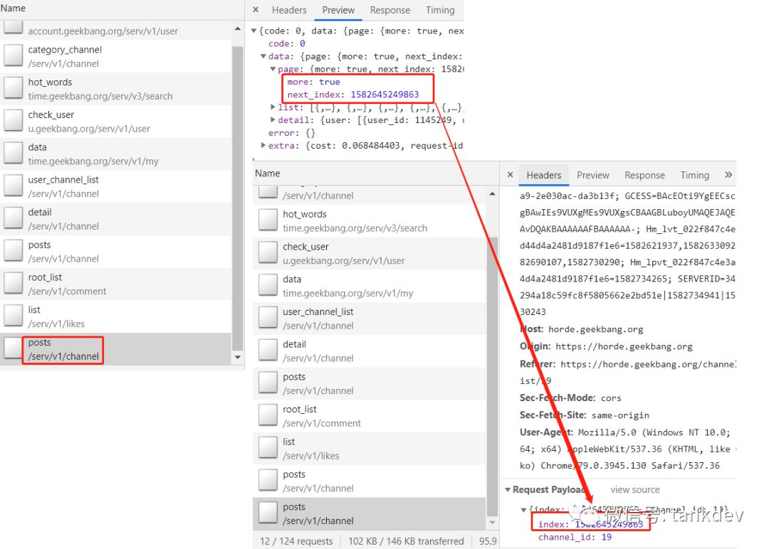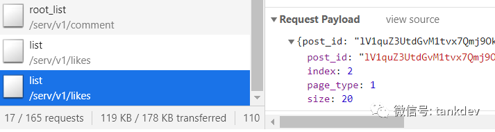 从图中可以分析出关键信息字段,没错这就是我们要的接口。往下滑动会发现分页也是请求的这个接口,进一步确认了我们定位的信息。 从分页请求观察请求参数可以发现参数比较简单,下一页请求index 信息来源于上一页的结果