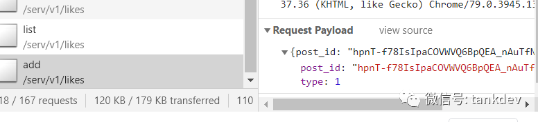 点击小火苗按钮观察请求接口https://horde.geekbang.org/serv/v1/likes/add