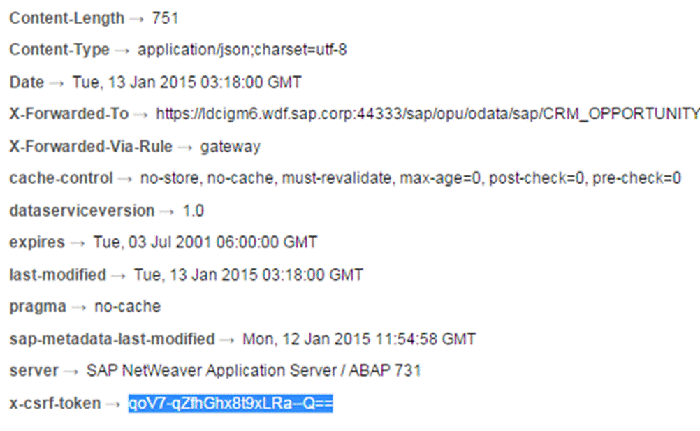 Click Send button, and the token is returned in HTTP response field x-csrf-token.