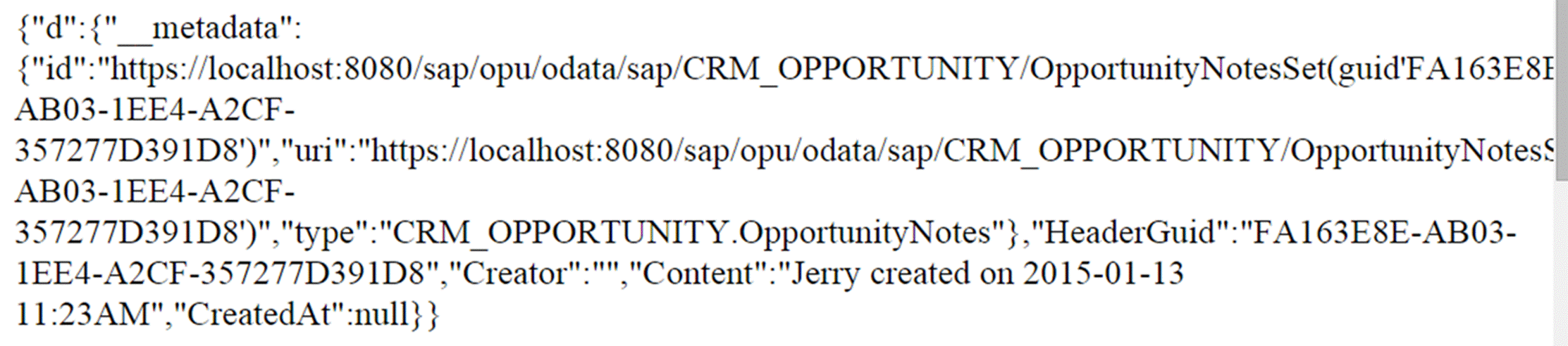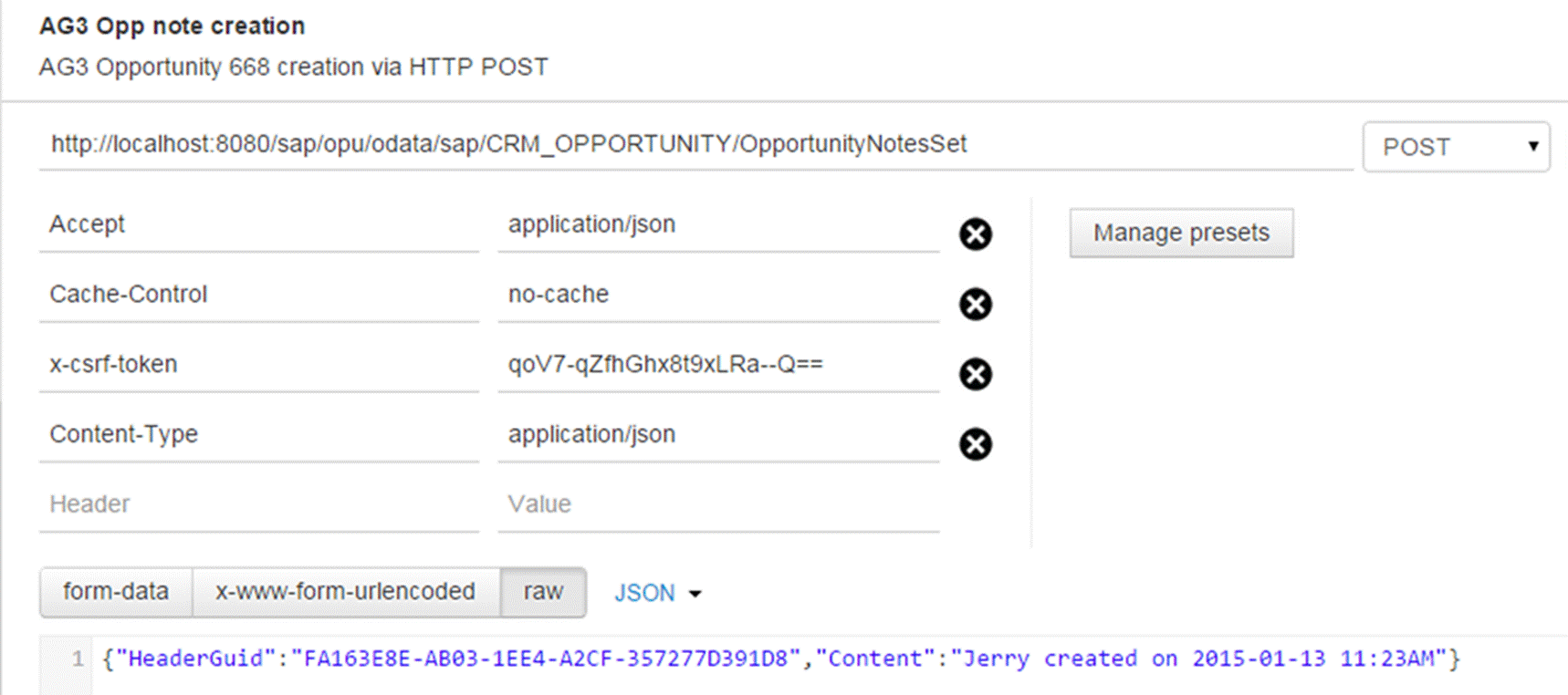 Then assemble a new HTTP post request with following settings, in http payload tab, choose option "raw" with format JSON, and paste the following json string containing Opportunity header guid and the note content you would like to create, click send button: