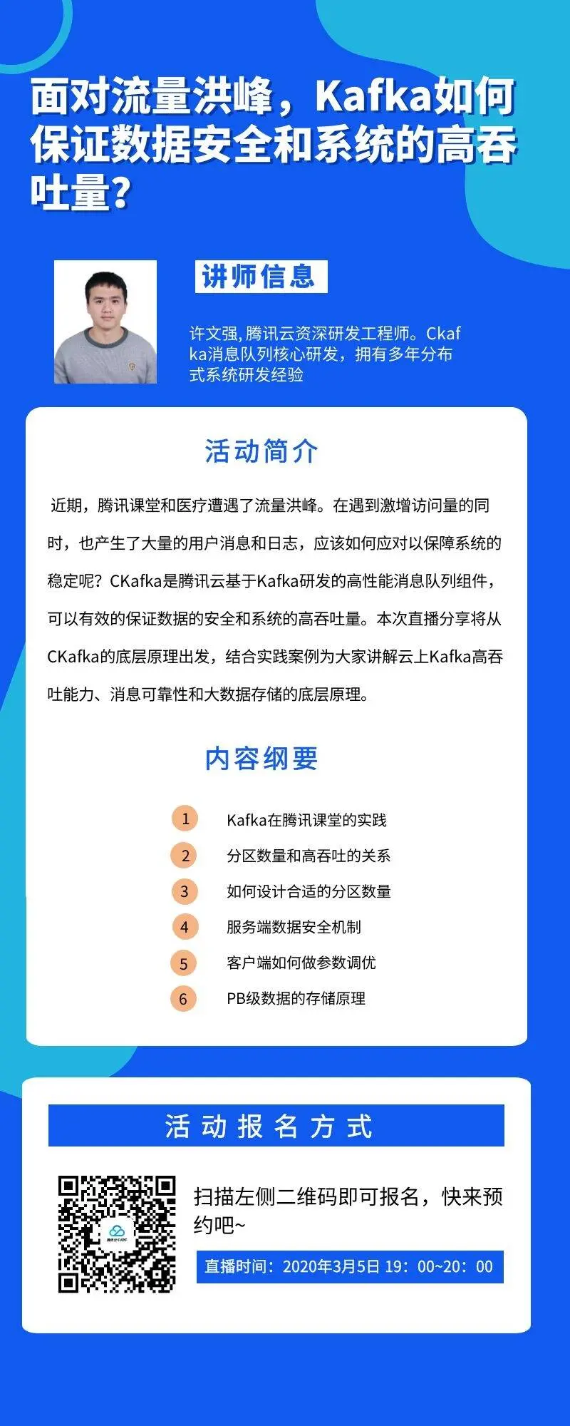 面对流量洪峰,Kafka如何保证数据安全和系统的高吞吐量? 腾讯云中间件 2020-02-27 1,554 阅读1分钟 导语:受疫情影响,在线教育和医疗遇到了流量洪峰,如何应对以保证数据的安全和系统的稳定呢?本次直播将由腾讯云中间件CKafka消息队列核心研发-许文强为大家带来技术分享,一起来看下有哪些技术干货吧~ 活动详情 互动有礼 参与线上直播互动,有机会赢取萌萌的鼠年公仔哦~快来报名预约吧! 技术交流 关注腾讯云中间件公众号并添加中间件小Q妹微信,可进群与讲师面对面进行技术交流.快快行动吧~