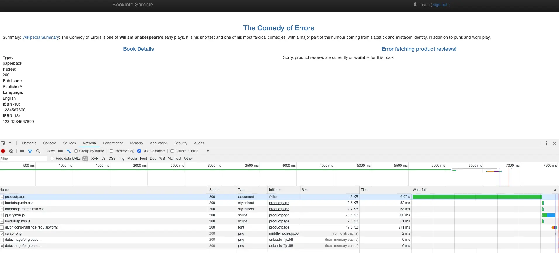 你期望 Bookinfo 主页在大约 7 秒钟加载完成并且没有错误。但是,出现了一个问题,Reviews 部分显示了错误消息,页面实际上用了大约 6s。