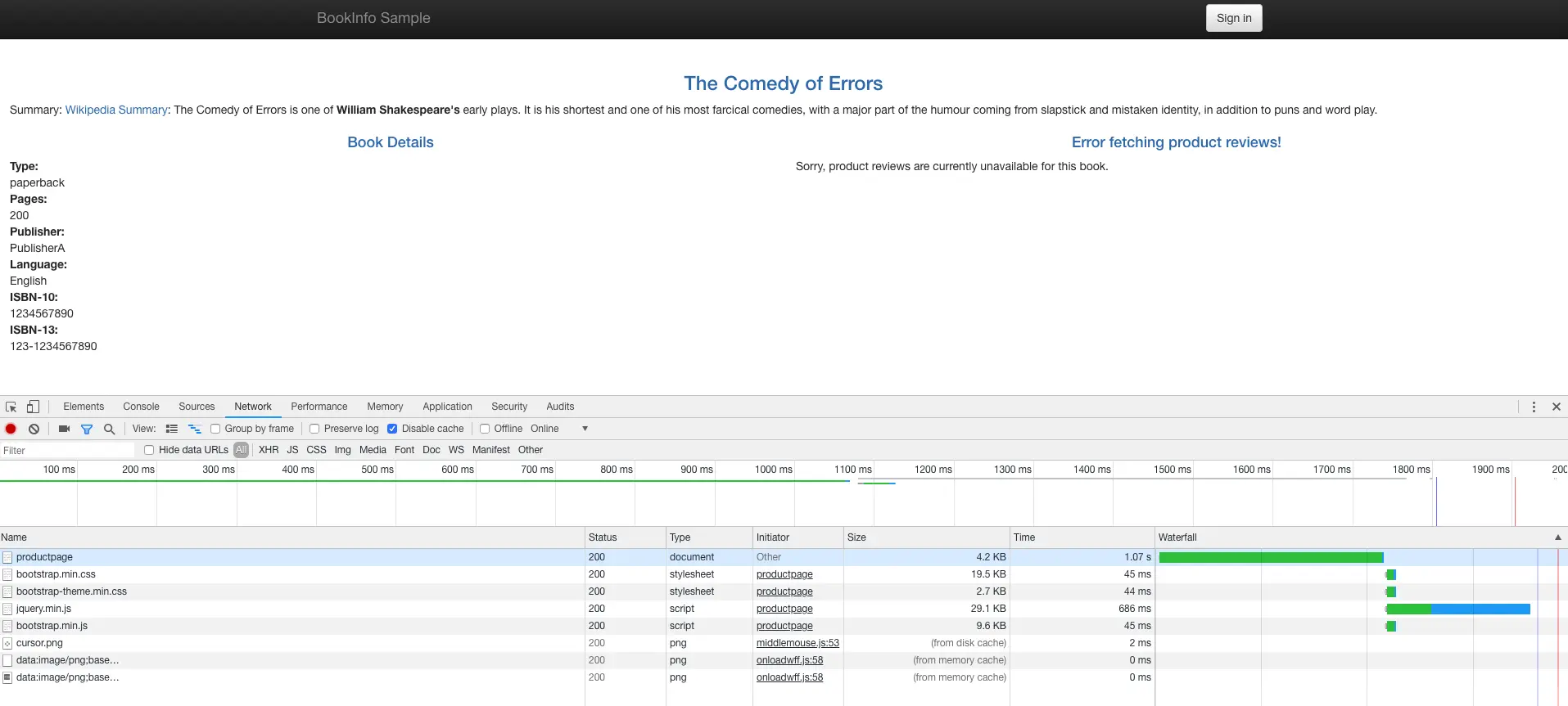 在1秒钟之后就会返回(即使超时配置为半秒,响应需要1秒的原因是因为服务中存在硬编码重试productpage,因此它reviews在返回之前调用超时服务两次。)