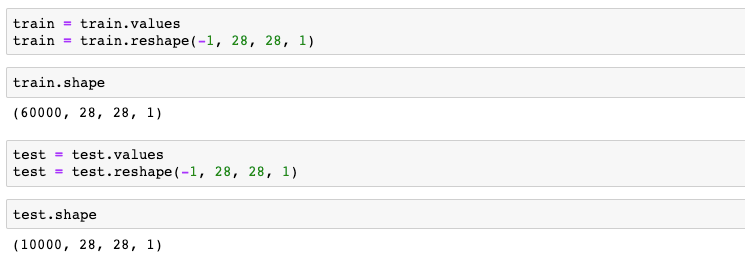 由于运算需要,我们需要将一维的图片数据转换成二维图片数据。将图片数据转换成长28,宽28,通道为1的格式,方便卷积计算。