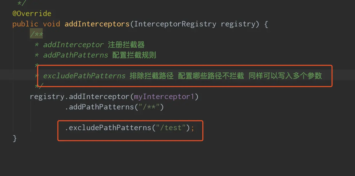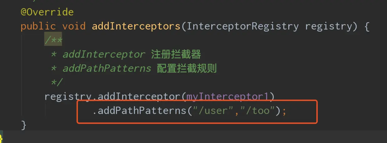 在注册拦截器的时候 配置拦截路径的addPathPatterns参数为可变长参数,就意味着可以接受String的数组,可以配置多个参数。
