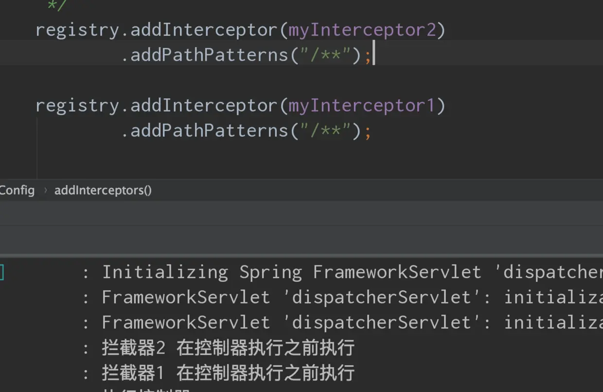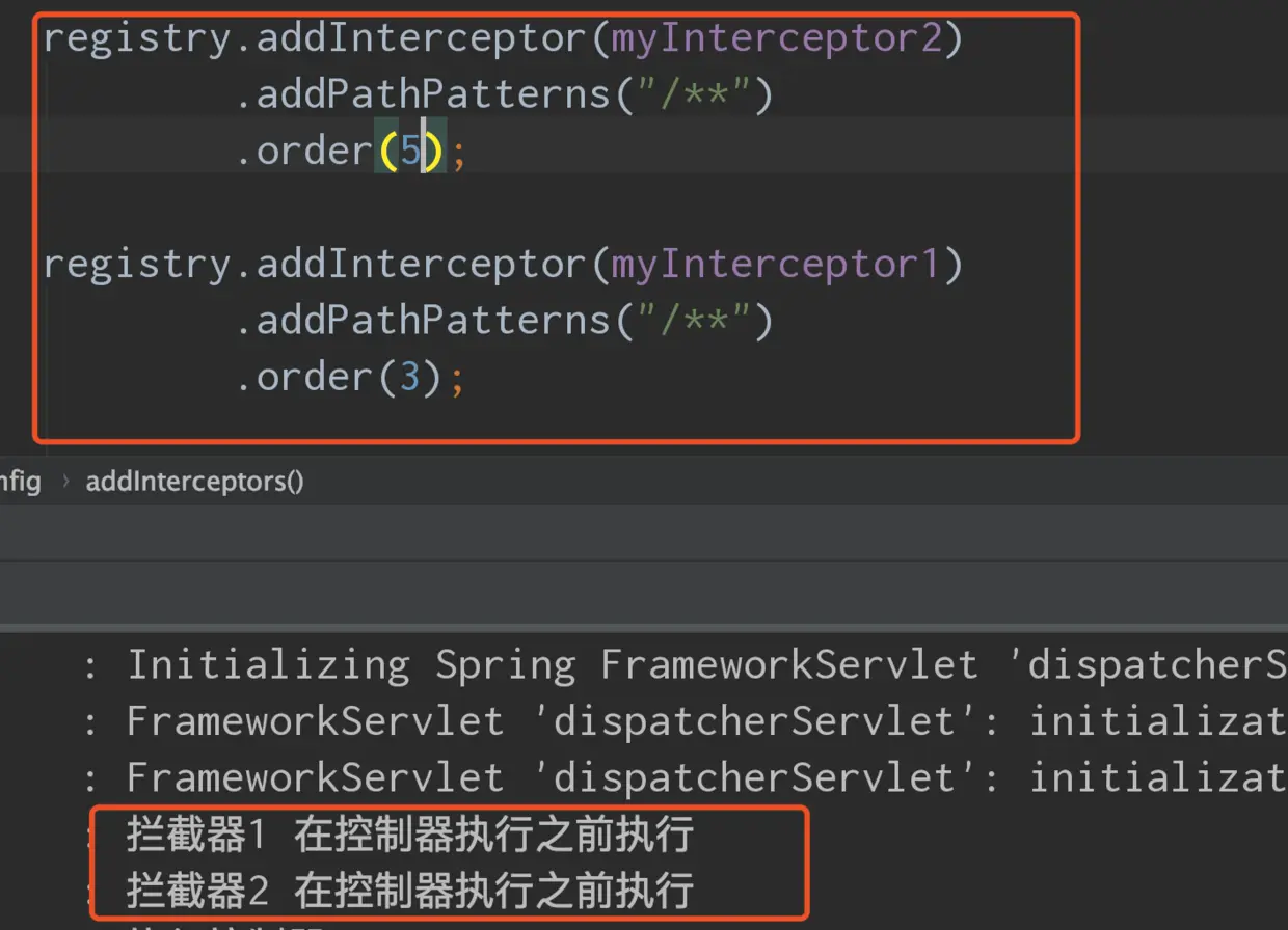 在不做任何设置的时候,多个拦截器的执行顺序和注册的顺序有关,先注册的先执行