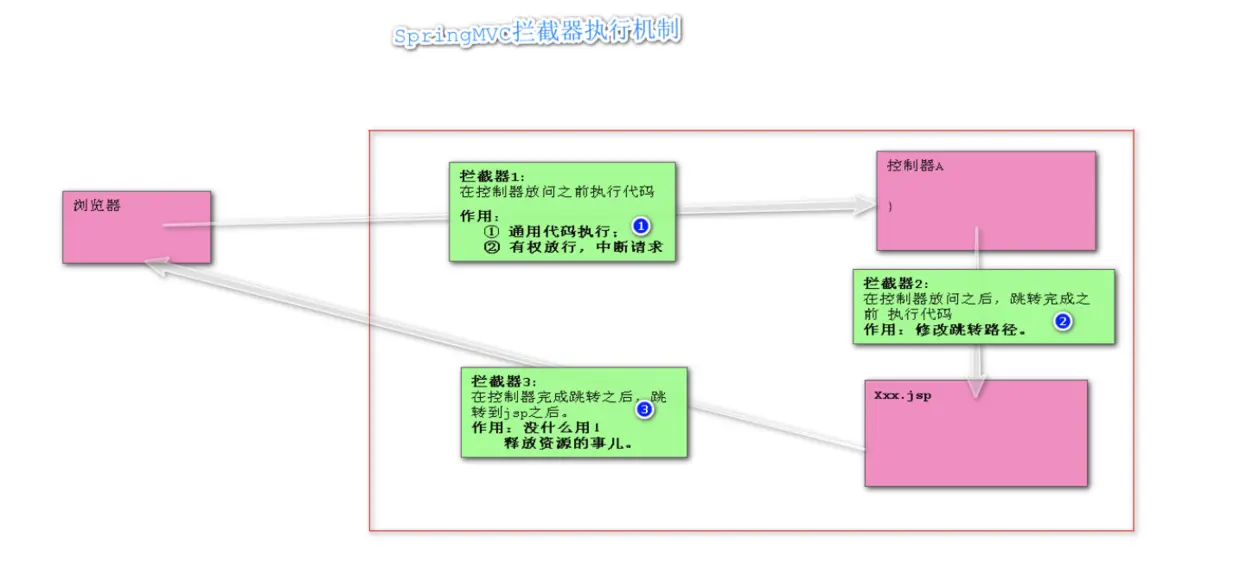 拦截器是Spring中的概念,和过滤器类似,可以对用户请求进行拦截过滤处理。但是相对于过滤器而言,拦截器要的控制更加的细节,拦截器可以在三个地方进行执行。