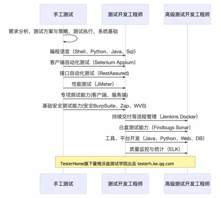 当前一线互联网大厂对不同职级测试开发工程师的能力要求可以参考下图: