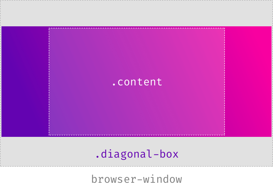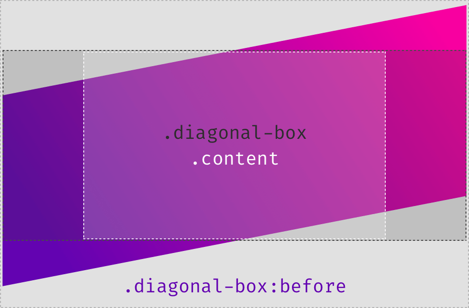 这里的 ::before 元素使用了绝对定位。为此,我们还需要为 .diagonal-box、.content 各加一句 position: relative 声明。为 .diagonal-box 加,是为了限制 ::before 是相对与它定位的;为 .content 加,是因为 ::before 使用绝对定位后,层级变高,会覆盖 .content 元素,我们给 .content 加 position: relative 后,就能避免覆盖了。