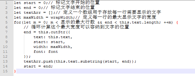 这里最关键的是要计算出每一行可以显示多少文本,利用canvas的measureText方法,可以达到这个效果,伪代码如下所示。