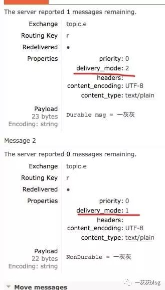 /** * 推送一个非持久化的消息,这个消息推送到持久化的队列时,mq重启,这个消息会丢失;上面的持久化消息不会丢失 * * @param ans * @return */private String publish2mq2(String ans) { MessageProperties properties = new MessageProperties(); properties.setDeliveryMode(MessageDeliveryMode.NON_PERSISTENT); Message message = rabbitTemplate.getMessageConverter().toMessage("NonDurable = " + ans, properties); rabbitTemplate.convertAndSend(MqConstants.exchange, MqConstants.routing, message); System.out.println("publish: " + message); return message.toString();}private String publish2mq3(String ans) { String msg = "Define msg = " + ans; rabbitTemplate.convertAndSend(MqConstants.exchange, MqConstants.routing, msg, new MessagePostProcessor() { @Override public Message postProcessMessage(Message message) throws AmqpException { message.getMessageProperties().setHeader("ta", "测试"); message.getMessageProperties().setDeliveryMode(MessageDeliveryMode.NON_PERSISTENT); return message; } }); return msg;}