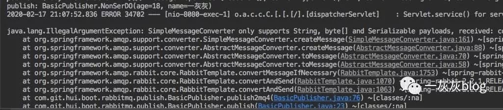 private String publish2mq4(String ans) { NonSerDO nonSerDO = new NonSerDO(18, ans); System.out.println("publish: " + nonSerDO); rabbitTemplate.convertAndSend(MqConstants.exchange, MqConstants.routing, nonSerDO); return nonSerDO.toString();}@Datapublic static class NonSerDO { private Integer age; private String name; public NonSerDO(int age, String name) { this.age = age; this.name = name; }}