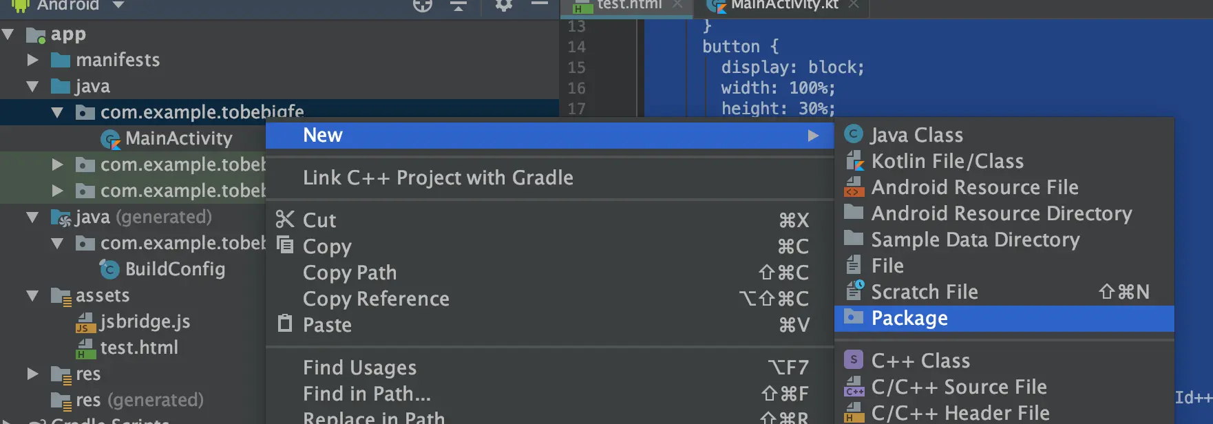 对app/java/com.example.tobebigfe点右键,进行如下图操作: