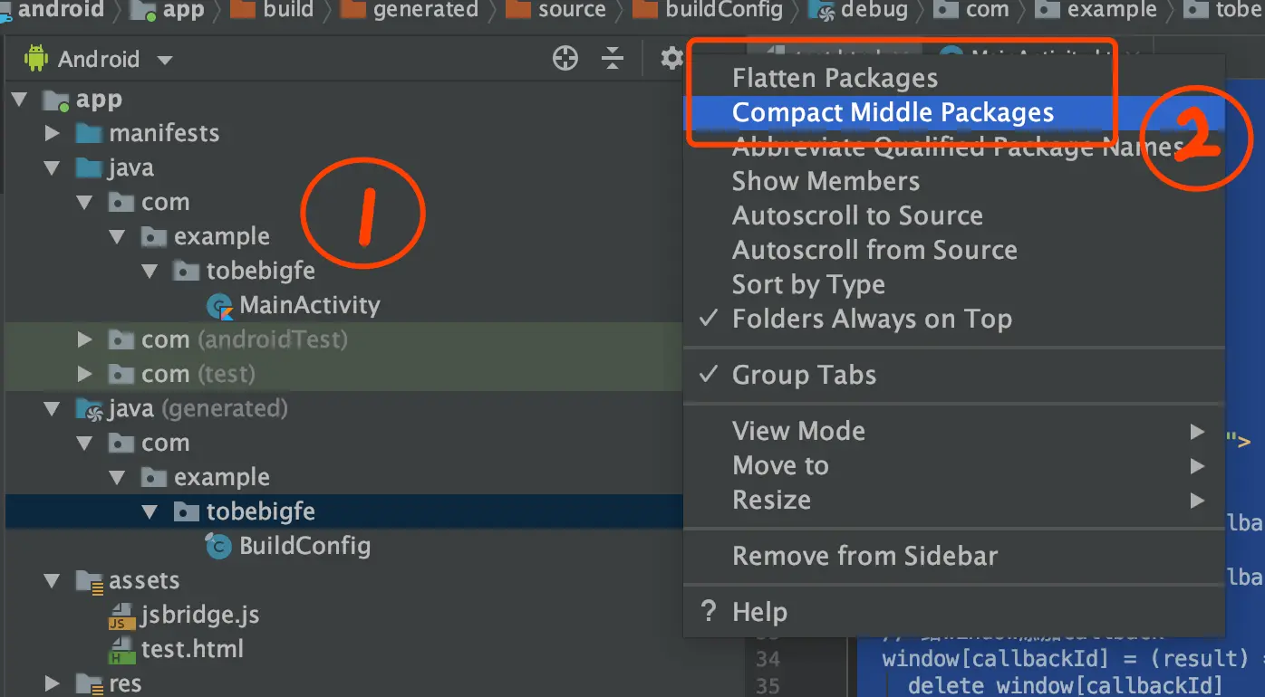 注意你的android路径有可能是这样的,如图第1点中,不是扁平的包名,那么可以勾上第2点中的两项: