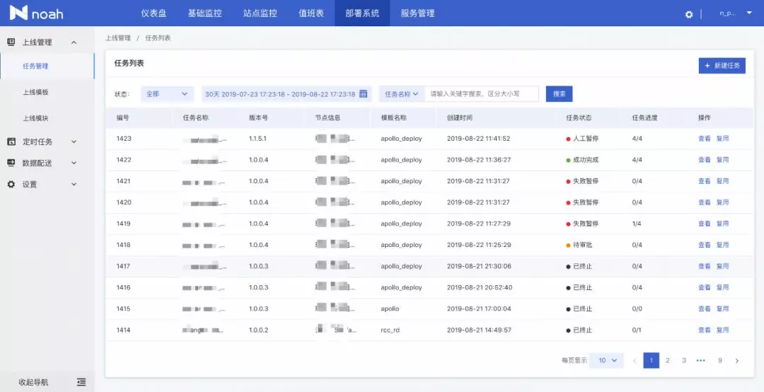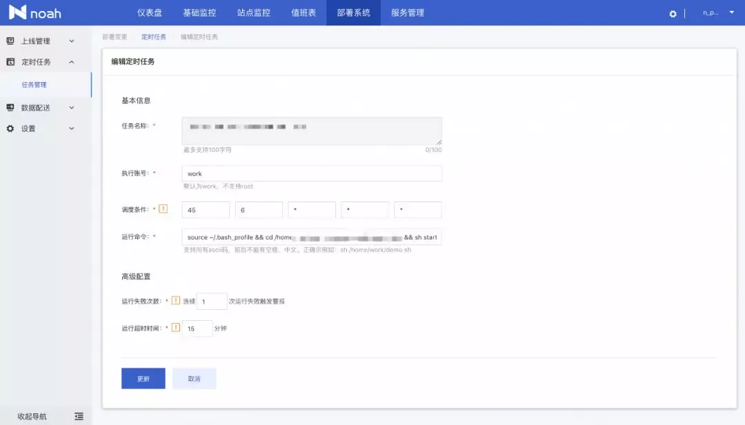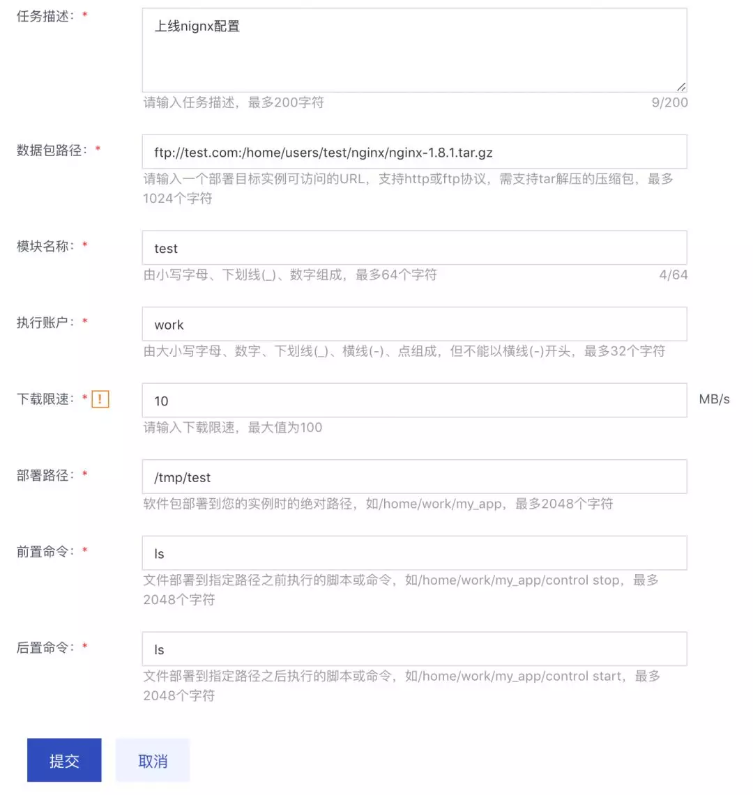 如图1所示为变更管理中新建部署任务示例,指定上线内容,上线模块,上线之后运行账户、部署路径等信息,提交之后,部署程序将会根据提交信息执行部署上线操作。