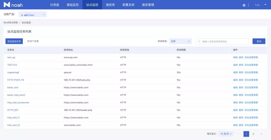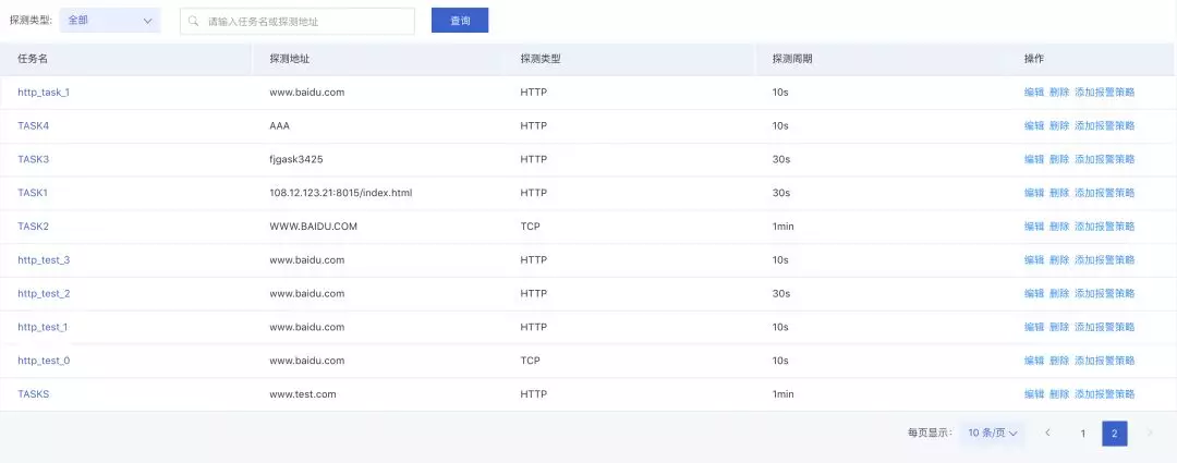除上述运维操作之外,另外一个最常见的运维展现场景是数据展示类,如展示历史上线任务信息、监控任务信息、机器域名等资产信息、最常见的展现方式就是使用表格将任务展示出来。如图2所示为监控任务列表页面,通过表格一行一行展示监控任务的概要信息。