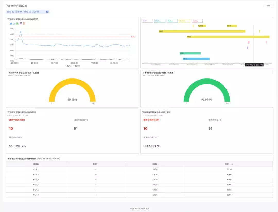 针对运维业务中数据可视化展现的需求,我们提供了可以自定义布局的可视化页面模板,通过与表单模板、列表模板结合从而构成完整的仪表盘功能。仪表盘主要提供页面布局自定义配置(包括组件位置、大小、排版自定义)、组件基础信息的可视化配置(包括数据来源、外观、交互等)、自定义页面的展示和管理等功能。如图7所示为使用仪表盘创建的一个可视化展示页面。
