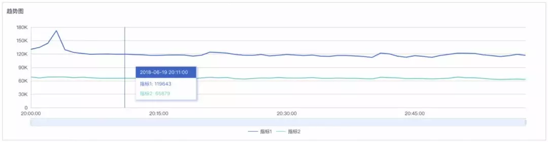 另外像监控业务场景中,常常需要比表格更直观的展现数据形式,通常可以采用趋势图、柱状图、饼图、事件流图等数据可视化展现形式。如图3所示为某服务在一段时间内的PV情况,使用趋势图展现可以很清晰地看出数据随时间变化和波动的情况。