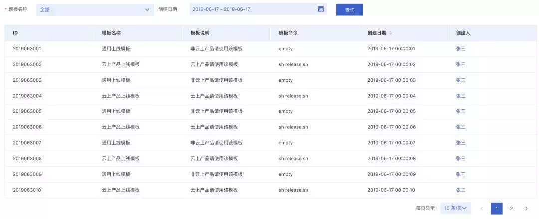 如图5所示为列表模板的使用示例,只需提供如图6所示JSON数据用来描述需要展示的运维对象,就能生成如下图所示的列表页面,开发者不再需要编写复杂的JS代码来处理繁杂的前端业务逻辑,也不需要关心如何获取表格展示数据,如何获取用户填写的表单内容,也不需要关心分页和数据展示的逻辑,极大降低了运维管理平台开发的难度,提升了运维管理平台的开发效率。