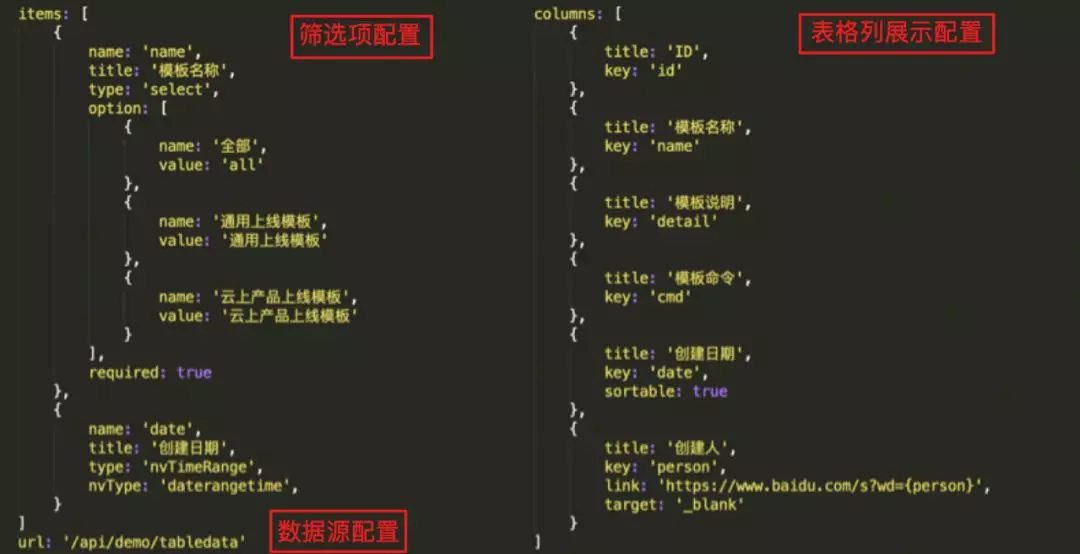 经过这些业务逻辑处理之后产出的页面模板,只需提供JSON配置信息就能轻松产出我们需要的前端展示页面。