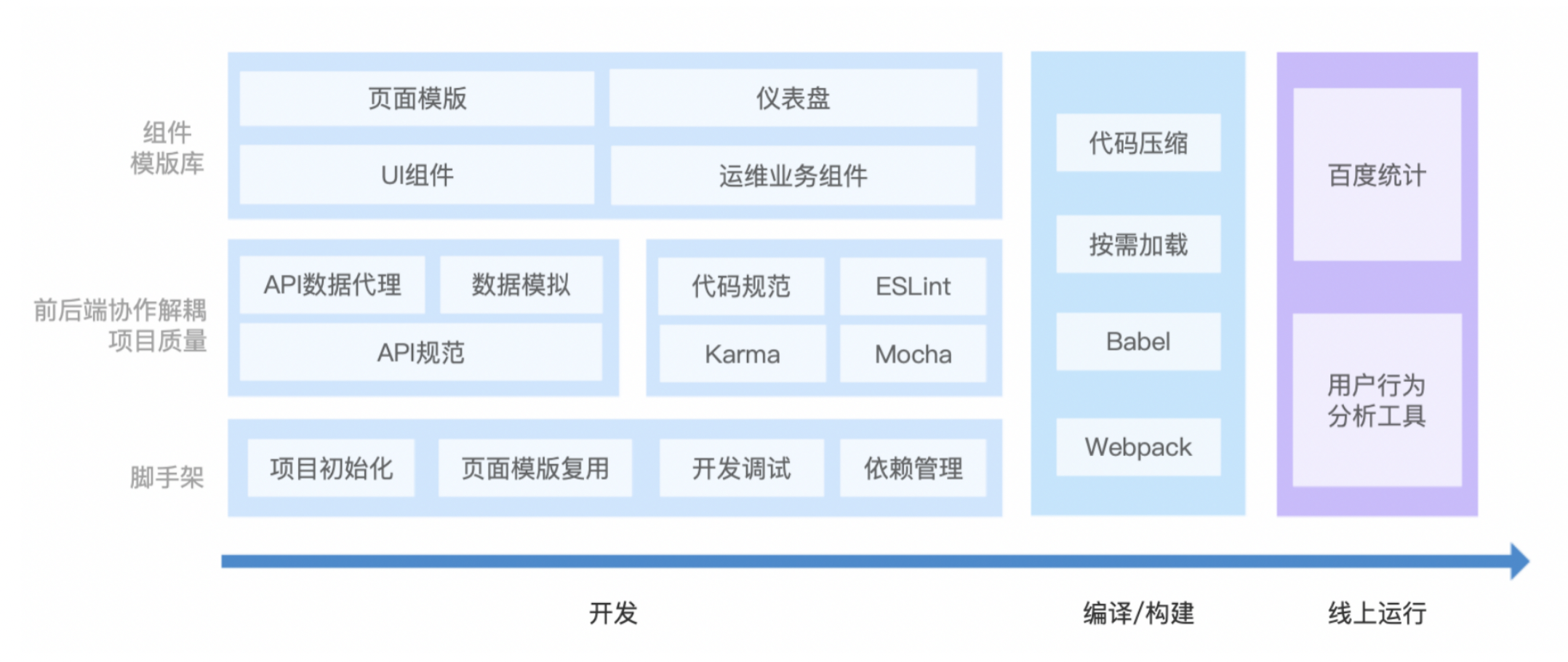 此外我们也结合丰富的运维前端研发经验沉淀出项目开发的最佳实践,包括项目初始目录结构、页面模板复用、开发调试、前后端协作、前端路由管理、编译构建、线上运行统计分析等,同时也将上述部分功能和实践集成到了脚手架中,通过输入简单的命令就能很简单高效的完成项目初始化、页面模板复用、项目开发调试。这些工具和功能通过建立规范的前端工程化体系能在页面模板和仪表盘的基础上再次提升运维前端项目的研发效率。