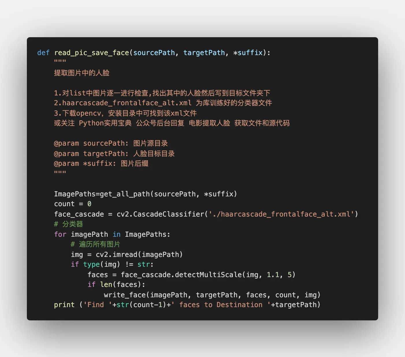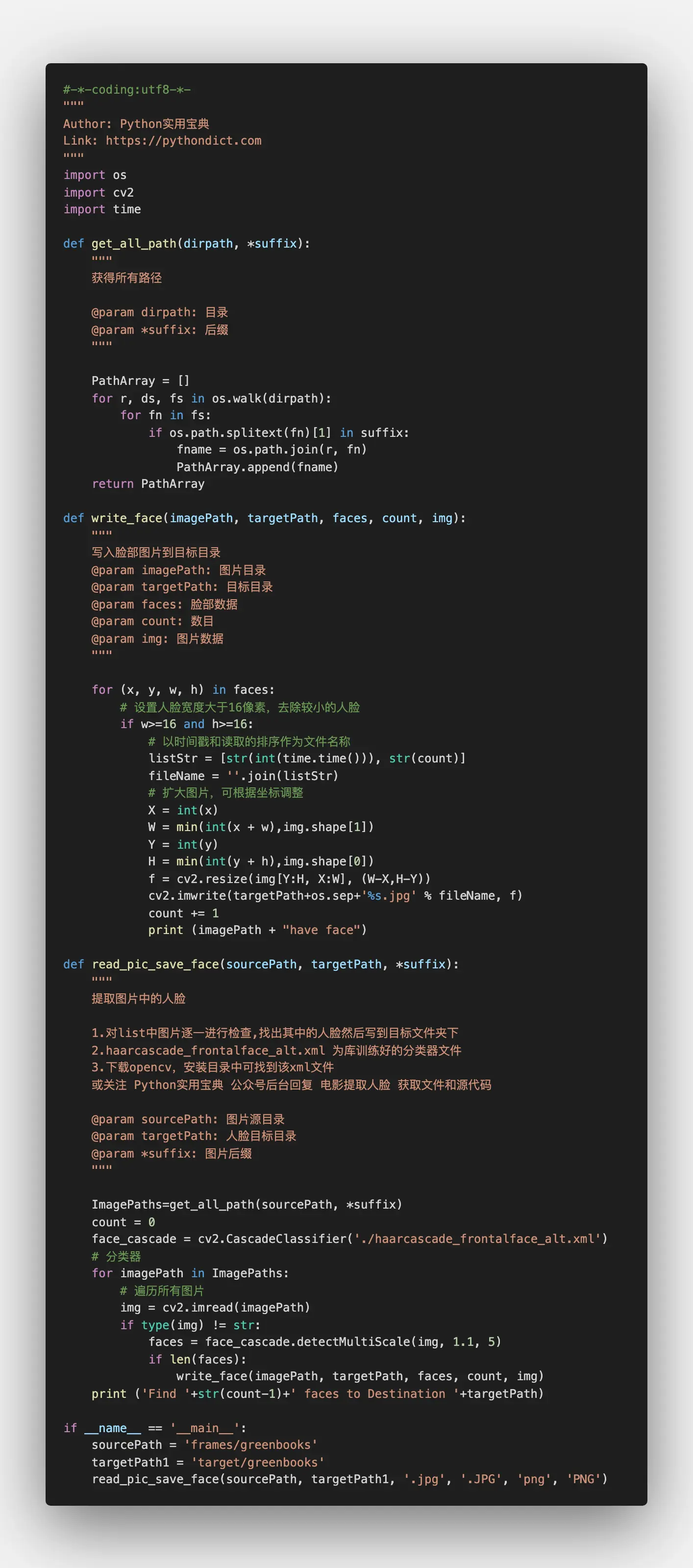 怎么样,是不是特别简单?完整代码如下(可关注Python实用宝典公众号,后台回复 电影提取人脸 下载):