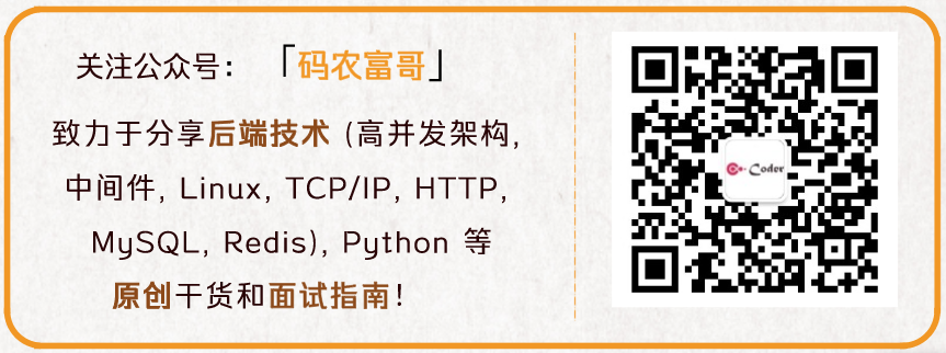 原创文章首发于公众号:「码农富哥」,致力于分享后端技术 (高并发架构, 中间件, Linux, TCP/IP, HTTP, MySQL, Redis), Python 等原创干货和面试指南!