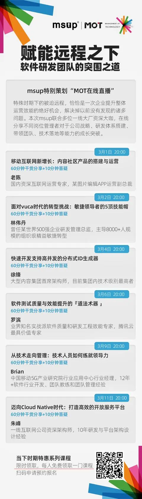 为了帮助研发团队打破窘境,更好的完成飞跃和进阶,msup和诸位大咖讲师,在过去的三周里,精心打磨了针对产品、团队、架构、测试关键岗位角色的体系套课,帮助团队提升整体技能。