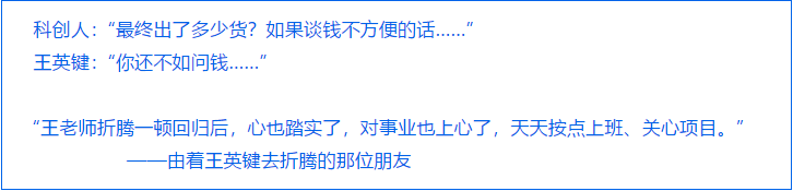 采访的后半程,王英键开启了反问模式,连着问了《科创人》几个问题,“你们为什么要做?你们追求的是什么?为什么要选择创业的话题?” 紧张谦卑地一一作答之后,王英键倒是很给面子,没说咱不靠谱。但他严肃表示,希望能完整表达他对创业这件事的看法:谈创业、分享创业经验?没问题;年轻人想创业?勇敢闯,要趁早;但必须要说清楚,创业毕竟是少数人笑到最后的挑战,意味着巨大的风险与极低的成功率。