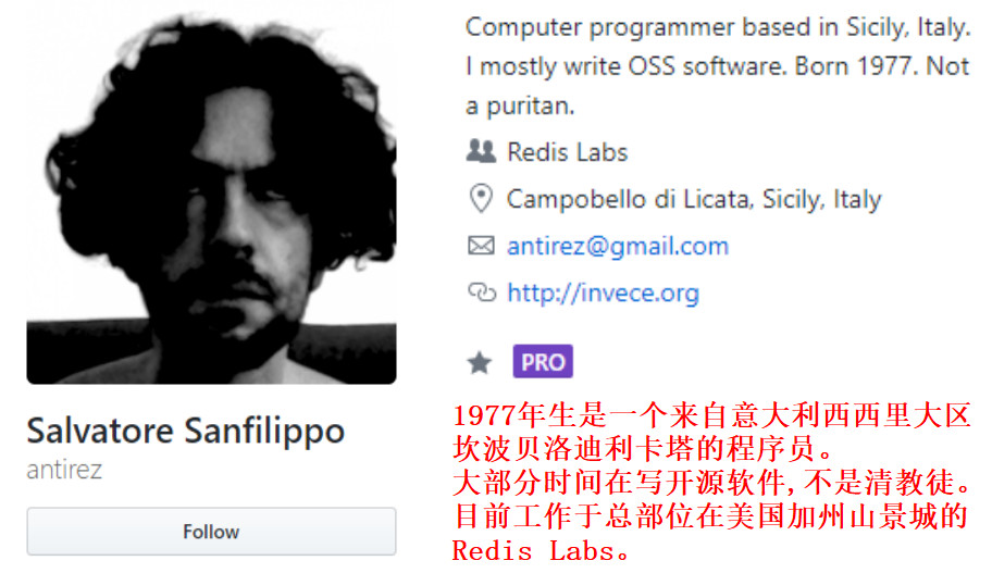 Redis的之父是来自意大利的西西里岛的Salvatore Sanfilippo,Github网名antirez,笔者找了作者的一些简要信息并翻译了一下,如图: