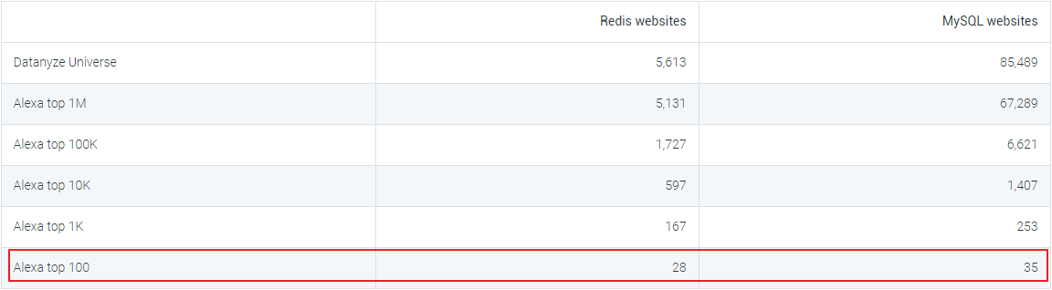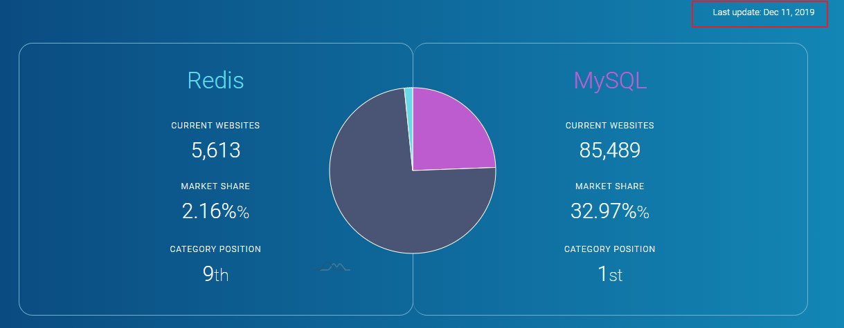 笔者查了datanyze.com网站看了下Redis和MySQL的最新市场份额和排名对比以及全球Top站点的部署量对比(网站数据2019.12):