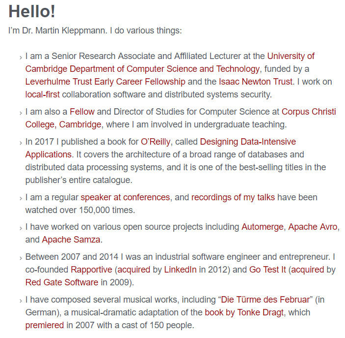2016年2月8号分布式系统的专家马丁·克莱普曼博士(Martin Kleppmann)在一篇文章How to do distributed locking 指出分布式锁设计的一些原则并且对Antirez的Redlock算法提出了一些质疑。笔者找到了马丁·克莱普曼博士的个人网站以及一些简介,一起看下: