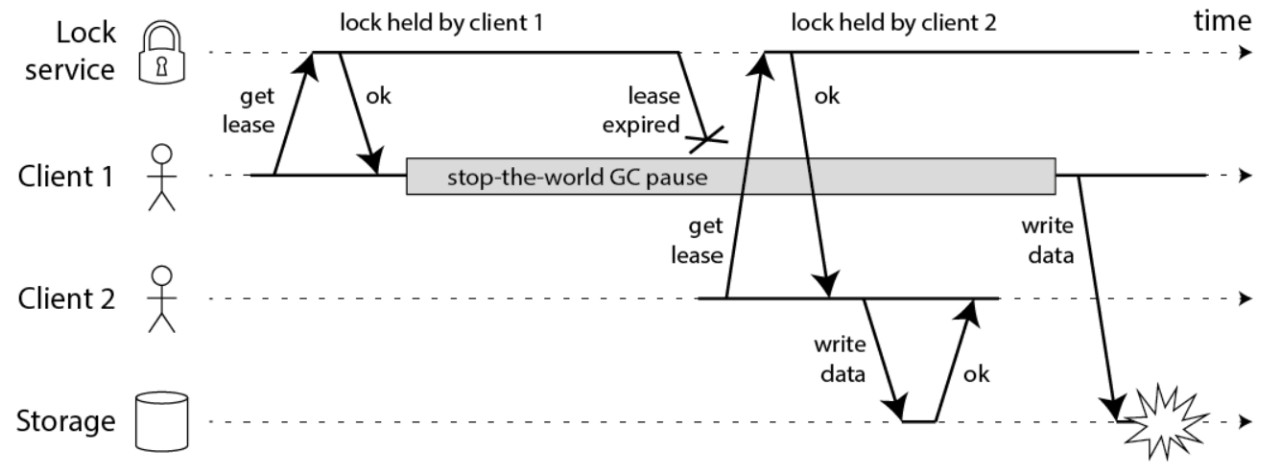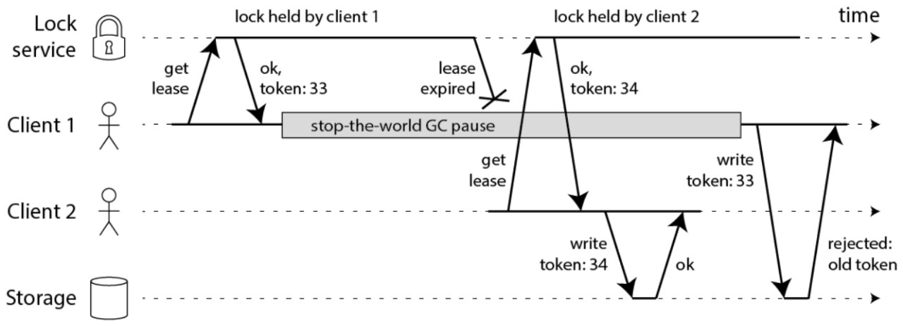 客户端1获得锁并且获得序号为33的令牌,但随后它进入长时间暂停,直至锁超时过期,客户端2获取锁并且获得序号为34的令牌,然后将其写入发送到存储服务。随后,客户端1复活并将其写入发送到存储服务,然而存储服务器记得它已经处理了具有较高令牌号的写入34,因此它拒绝令牌33的请求。