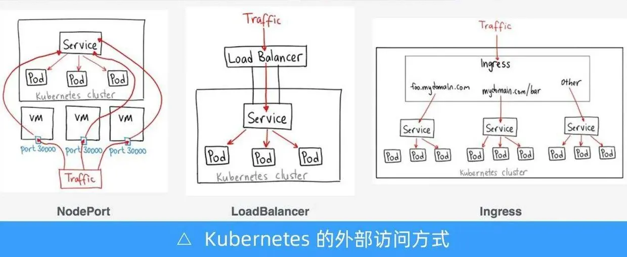 在 K8S 中,服务跟 Pod IP 主要供服务在集群内访问使用,对于集群外的应用是不可见的。怎么解决这个问题呢?为了让外部的应用能够访问 K8S 集群中的服务,通常解决办法是 NodePort 和 LoadBalancer。
