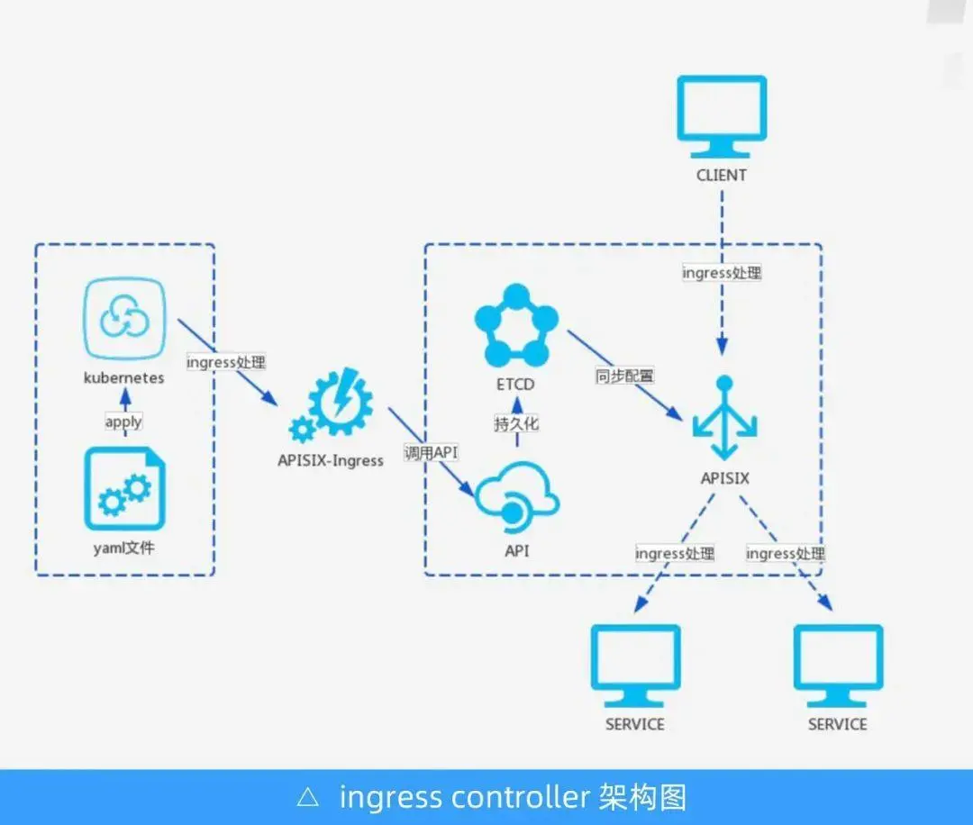 实现 ingress,本质上就是两点。第一点,需要将 K8S 集群中的配置,或者 K8S 集群中的状态同步到 APISIX 集群。第二点,需要将 APISIX中 的一些概念,比如像服务、upstream 等概念定义为 K8S 中的 CRD。实现了第二部分的话,通过 K8S ingress 的配置,很快的去产生 APISIX,通过 APISIX ingress controller 就会产生 APISIX 相关的配置。我们当前为了快速的将 APISIX 落地为能够支持 K8S 的 ingress 。我们创建了一个开源项目,叫 ingress controller。