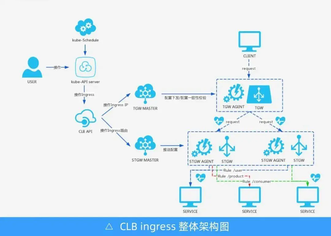 CLB 是怎么样的?上图是腾讯云 CLB ingress 的整体架构图。因为我想从高性能、高可用的角度来讲我们的 ingress 集群,所以把 K8S 这块做了简化,只留了用户操作,API Server 以及控制器这些。