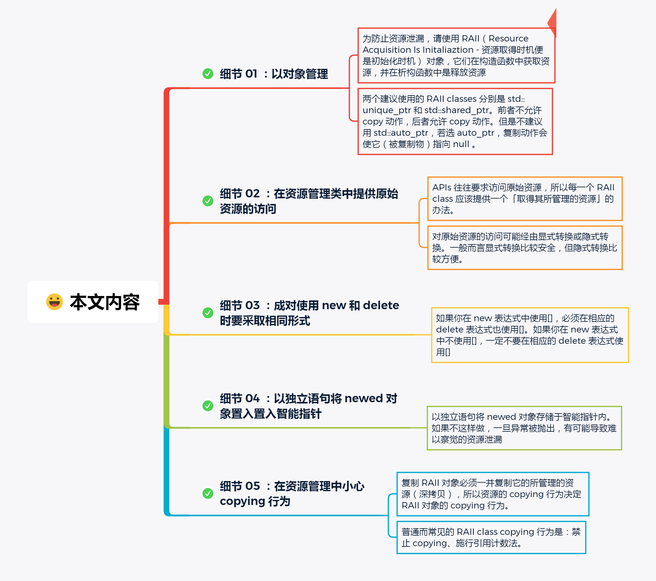 - 管理对象运用析构函数确保资源释放。不论控制流如何离开区块,一旦对象被销毁(例如当对象离开作用域)其析构函数自然会被自动调用,于是资源被释放。