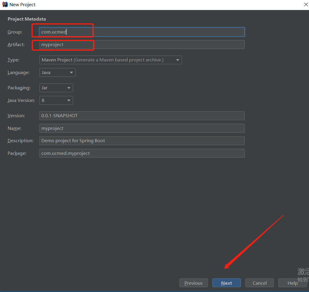 3.设置好自己的包名和项目名 其他的默认不用修改 点击next