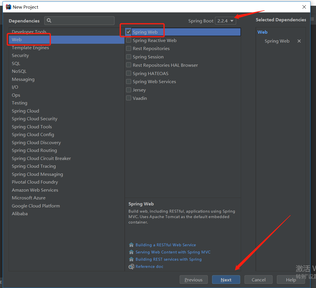4.如下图:在左侧的Web中找到Spring Web勾选上(可能idea的版本不一样 有些是Web) 选择要依赖的版本 点击next