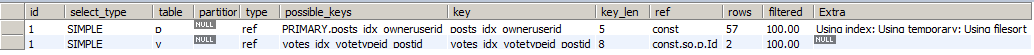 第一个变化是MySQL决定从Post表开始了(干得漂亮!)。这次使用新索引后,过滤掉绝大多数的行,并估算只有57行记录跟Vote表关联。