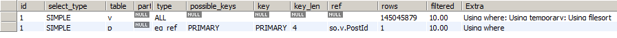 MySQL选Vote表开始。Explain结果显示,会遍历145,045,878(一亿四千多万)条记录。这个几乎是整个Vote表中全部记录。这个情况相当糟