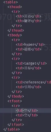 <thead>表示表头,一般为表格的首行<tbody>表示数据部分<tfoot>表示表尾<th>标签表示表头元素<td>表示表单数据