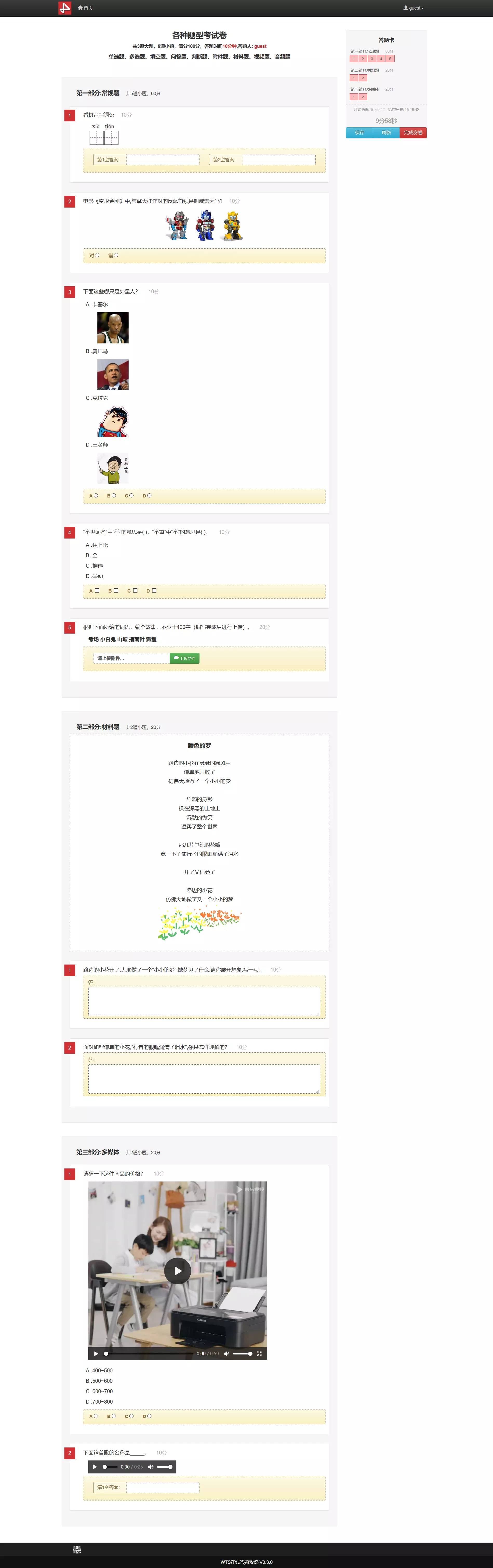 - 支持题型 :单选题、多选题、填空题、问答题、判断题、附件题、材料题、视频题、音频题