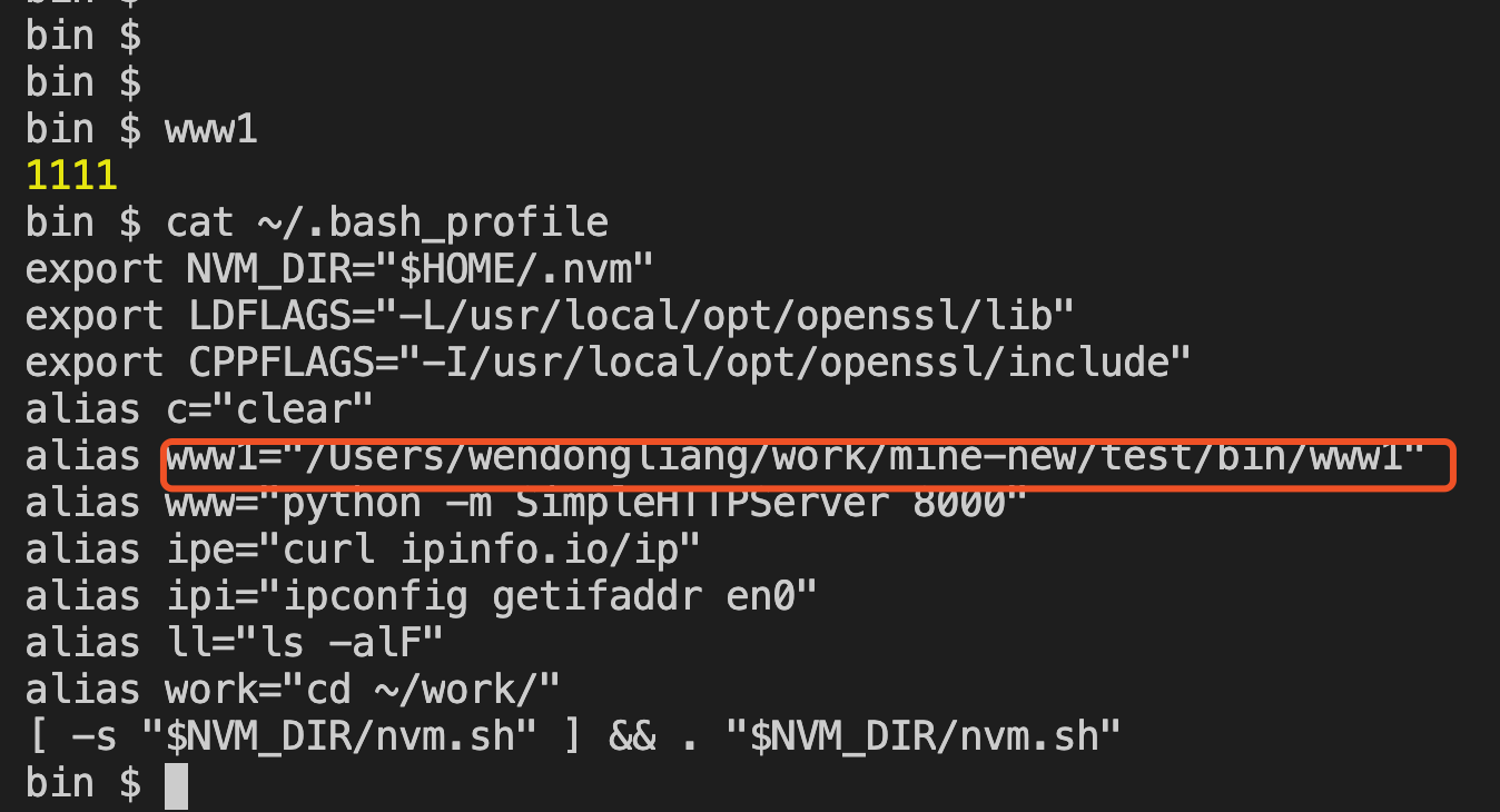 node.js创建可执行程序 文某某 2020-02-27 215 阅读1分钟 一个可执行文件www1想要执行他,可以 ./www1 或者添加环境变量后,执行source ~/.bash_profile 如下:就可以www1的形式执行该命令了。