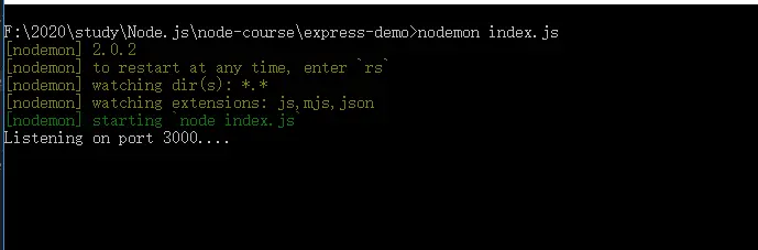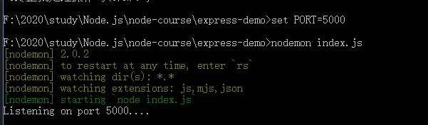 运行完,我们再次运行nodemon index.js,可以看到现在监听的是5000端口了,如下图