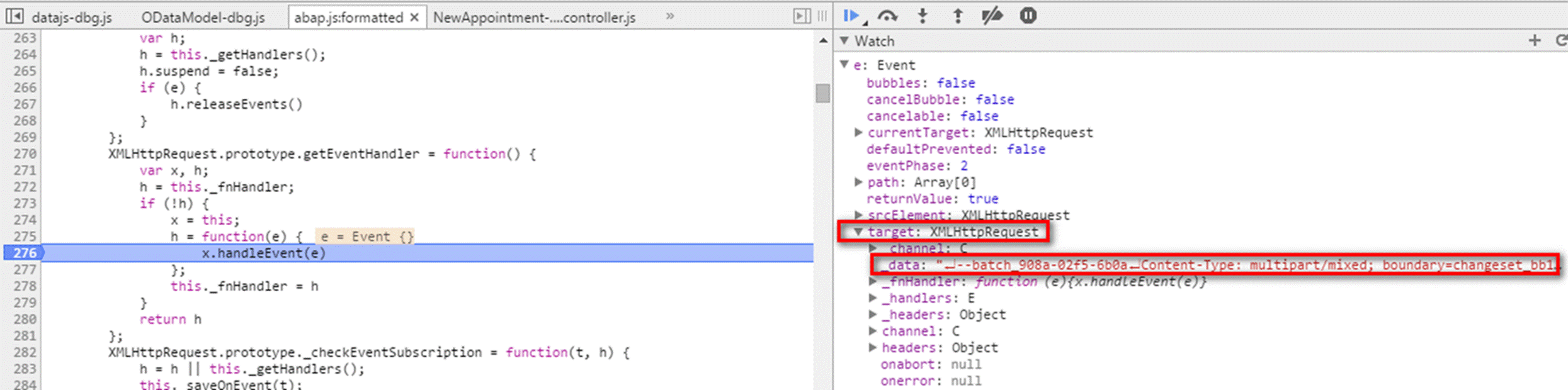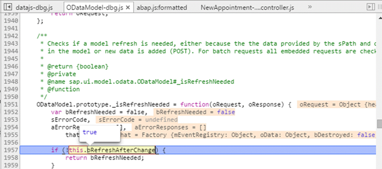 So why is this difference between two systems? In Chrome development tool, search the boolean variable name and we found one function setRefreshAfterChange defined for ODataModel. Just set a breakpoint in this method and re-launch the application in my internal system from beginning: