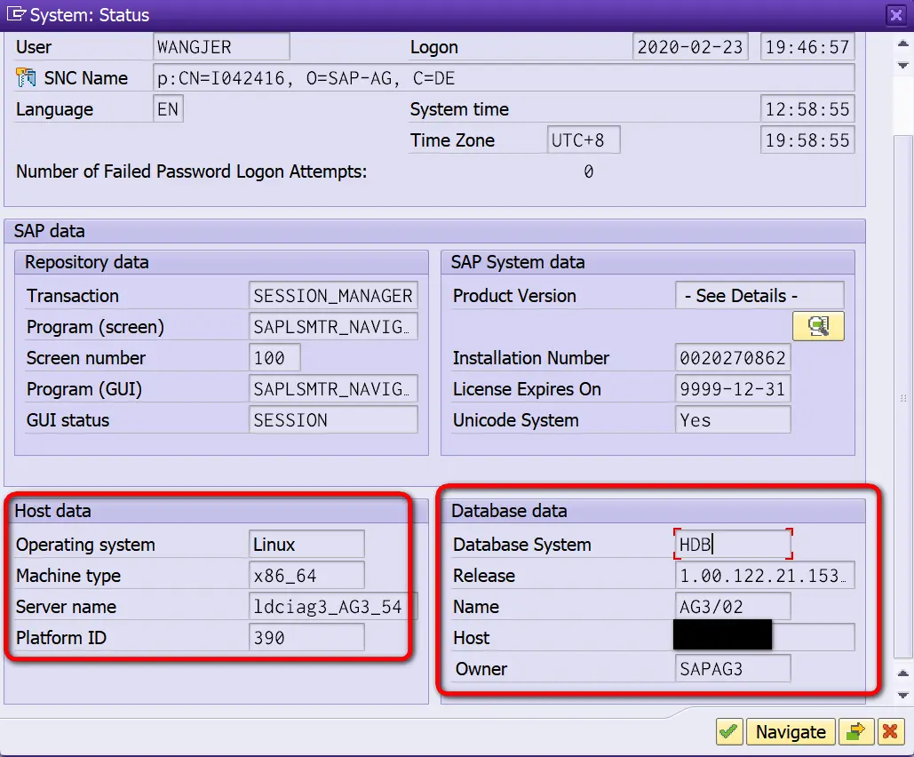 成功登录后,在SAP Status菜单里,能看到这个SAP服务器对应的数据库明细,以及当前安装的操作系统类型: