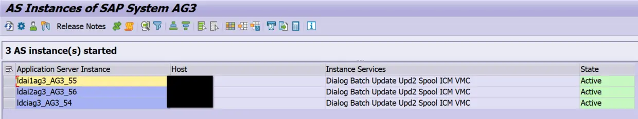 使用事务码SM51,可以查看这个SAP系统的三个应用服务器实例的名称和主机名,当前我们登录的是正中以56结尾的实例。