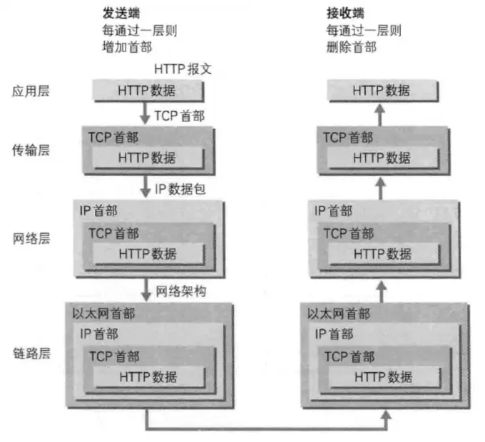 利用TCP/IP协议族进行网络通信时,会通过分层顺序与对方进行通信。发送端从应用层往下走,接收端则往应用层往上走。